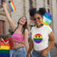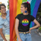 face against rainbow flag stripes.