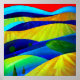 An abstract landscape of rolling hills in bright vibrant colors with angular lines.