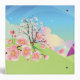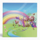 Very colorful fantasy land with a huge rainbow, polka dot twisted mushroom houses, twirly candycane striped trees and lollipops with a stream and stone walkway -on the back is a cute cherry blossom tree blowing in the wind with blossom petals falling.