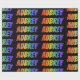 This exciting, fun, multicolored wrapping paper design features the common first name "AUBREY" having a colorful rainbow spectrum gradient inspired coloring pattern. The background is colored black. Exciting wrapping paper like this might be a fun way to wrap a gift or present being given to somebody named Aubrey. [~Z0000354]