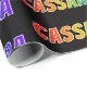 This exciting, vibrant, fun wrapping paper design features the common first name "CASSANDRA" having a colorful rainbow spectrum gradient inspired coloring pattern. The background is colored black. Colorful wrapping paper like this might be a fun way to wrap a present being given to somebody named Cassandra. [~Z0000354]