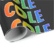 This vibrant, exciting, fun wrapping paper design features the common first name "COLE" having a colorful rainbow spectrum inspired coloring pattern. The background is colored black. Exciting wrapping paper like this might be a fun way to wrap a gift being given to somebody named Cole. [~Z0000354]