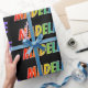 This multicolored, exciting, fun wrapping paper design features the common first name "MADELINE" having a colorful rainbow spectrum inspired coloring pattern. The background is colored black. Vibrant wrapping paper like this might be a fun way to wrap a present or gift being given to somebody named Madeline. [~Z0000354]