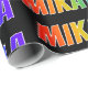 This fun, vibrant, multicolored wrapping paper design features the common first name "MIKAYLA" having a colorful rainbow spectrum gradient like coloring pattern. The background is colored black. Exciting wrapping paper like this might be a fun way to wrap a gift or present being given to somebody named Mikayla. [~Z0000354]