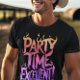 An illustration of the phrase Party Time Excellent in pink, red, and orange stylized flames against a black background.