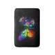 Rainbow, luminous, artistically painted monarch butterfly with bouquet of iridescent, bright, luminescent roses on black background. Rainbow butterfly.