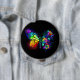 Rainbow, luminous, artistically painted monarch butterfly with bouquet of iridescent, bright, luminescent roses on black background. Rainbow butterfly.