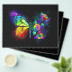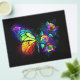Rainbow, luminous, artistically painted monarch butterfly with bouquet of iridescent, bright, luminescent roses on black background. Rainbow butterfly.