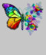 Rainbow, luminous, artistically painted monarch butterfly with bouquet of iridescent, bright, luminescent roses on black background. Rainbow butterfly.