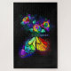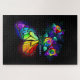 Rainbow, luminous, artistically painted monarch butterfly with bouquet of iridescent, bright, luminescent roses on black background. Rainbow butterfly.