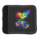 Rainbow, luminous, artistically painted monarch butterfly with bouquet of iridescent, bright, luminescent roses on black background. Rainbow butterfly.