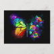 Rainbow, luminous, artistically painted monarch butterfly with bouquet of iridescent, bright, luminescent roses on black background. Rainbow butterfly.