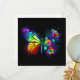 Rainbow, luminous, artistically painted monarch butterfly with bouquet of iridescent, bright, luminescent roses on black background. Rainbow butterfly.