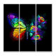 Rainbow, luminous, artistically painted monarch butterfly with bouquet of iridescent, bright, luminescent roses on black background. Rainbow butterfly.
