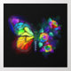 Rainbow, luminous, artistically painted monarch butterfly with bouquet of iridescent, bright, luminescent roses on black background. Rainbow butterfly.