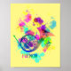A fun and colorful design with a French horn, musical instrument in bright rainbow colors done in an artistic paint splatter style, very cool and trendy.