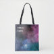 This etherial galaxy tote bag is perfect for a modern, whimsical woman. The design features a colorful cosmic background with stars and modern typography for an "out of this world" look.