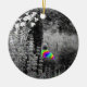 Does visiting a garden make you happy? This is a happy garden with a little rainbow twist. The trees and flowers appear almost monochromish, mostly black-and-white with slightly colored hues. The garden visitor, sitting on a bench, appears to be dressed in vivid rainbow colors. This image is derived from an original photograph of a beautiful botanical garden, with digital filters applied to give the visitor a shirt of many colors. This Christmas ornament is a a reminder of summer gardens that you can hang on a tree, add to your decor, or give as a holiday gift.
