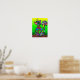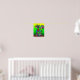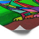 Decorate your walls in style with this unique, colorful art poster taken from an acrylic painting. In this whimsical abstract artwork, this rainbow colored cat, composed of multicolored geometric shapes in every color of the rainbow, sits on a brown surface against an ombre green and yellow background. She has one blue eye and one green eye, as well as a red collar with a golden bell.