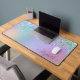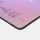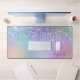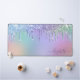 Cute girly desk mat featuring unicorn-colored rainbow faux glitter drips on rainbow background of purple, pink, blue, green, orange and yellow. Personalize with your name in a stylish purple script with swashes.