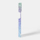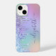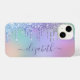 Custom elegant and girly iPhone case featuring unicorn-colored rainbow dripping faux glitter on a purple, pink, blue, green and orange background. Personalize with your name in a stylish trendy purple script with swashes.