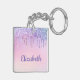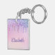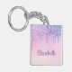 Girly personalized keychain featuring rainbow-colored faux dripping glitter down a pink background. Personalize with your name in purple script.
