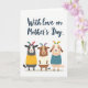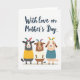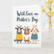 This greeting card features a simple white background with the message “With love on Mother’s Day” placed across the upper area in dark blue lettering. Below the text, three friendly goat-like characters stand side by side, leaning slightly toward one another as if sharing a close moment ❤️. The left character has a gray body with a sunny yellow top, the middle one is warm brown with a creamy white outfit, and the right one is pale with a teal-blue outfit. Each has rosy cheeks, a small heart-shaped nose, and an easy smile that suggests affection and togetherness without needing extra details. Their curved horns are striped in multiple rainbow colors, adding a bright, cheerful accent 🌼. The layout stays uncluttered so the figures and message remain the main focus, and a soft shadow sits just beneath their feet. The rainbow-striped horns stand out against the white space, with the teal outfit on the right adding a cool color balance near the bottom edge.