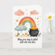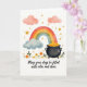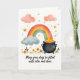 Designed with a white background that lets every detail stand out, this St. Patrick’s Day scene centers on a rainbow arcing across the upper middle in soft reds, oranges, yellows, greens, and blues 🌈. The rainbow begins at a pale sky-blue cloud on the left and lands in a matte-black pot on the right, where shiny gold coins spill over the rim ☘️. Two rosy pink clouds float nearby, and tiny gold stars and scattered speckles drift around them like a gentle shower. Along the lower edge, simple wildflowers in warm yellow and orange sit among leafy green sprigs, with a few loose coins tucked between the stems. The artwork has a light watercolor look that feels like an easy, friendly note shared between close friends. At the bottom, the message “May your days be filled with color and cheer” is set in flowing black lettering, centered beneath the flowers. Share St. Patrick’s Day sentiments with someone special, with the dark pot and bright coins catching the eye on the right side.