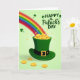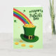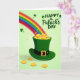 This design shows a deep emerald leprechaun hat filling the lower half of the card, set on a soft light-green ground, with a black band and a golden buckle catching the light. Gold coins spill from the hat in a way that feels like an inviting shared treasure, as if two friends just found it together and leaned in for a closer look 💚. From the upper left, a rainbow arcs across the sky and pours into the hat, with tiny golden stars and specks of white light drifting alongside it 🌈. The background shifts gently from lighter to deeper green, giving the scene a calm, airy setting while still feeling festive. In the upper right, the words “Happy St. Patrick’s Day” appear in green lettering, with small shamrocks placed near the text like little accents. More shamrocks float around the upper area, balancing the rainbow’s curve and guiding your eye back toward the coins. The hat’s brim is shaded to look rounded and substantial, and several coins rest on the ground in front, glinting beneath the rainbow’s end. Wavy bands of red, orange, yellow, green, blue, and purple sweep down into the hat beside scattered star shapes and pale sparkles.