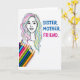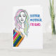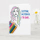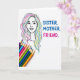 This card features a bright white background with a simple line drawing of a woman shown from the shoulders up, wearing a gentle smile and calm, steady eyes 👩. Her shoulder-length hair spreads outward in flowing, wavy strands that shift through pink, blue, green, yellow, and purple, like a rainbow of brushstrokes. The colorful hair feels like an affectionate spotlight, as if she’s being admired by someone close ❤️. In the lower-left corner, several sharpened colored pencils fan out diagonally, their tips matching the same range of hues found in her hair. The pencils point toward the portrait, creating a quiet connection between the tools and the tender, expressive look on her face. On the right side, the text reads “SISTER. MOTHER. FRIEND.” in all caps, with “SISTER.” and “MOTHER.” in deep blue and “FRIEND.” in warm fuchsia. The words sit in a neat vertical stack with clear spacing, balancing the portrait on the left. The rainbow hair arcs above the pencil tips while the fuchsia “FRIEND.” stands out at the bottom of the text column.