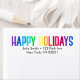 "Happy Holidays!" A colorful Holiday greeting in a modern font in rainbow colors. Easy to customize with your name and address. Part of our Rainbow Holiday Collection.