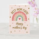 Designed with a soft, cozy look, this card features a stylized pastel rainbow centered on a light blush background, with arcs shifting from gentle coral and blush to creamy yellow and calm sage green. Each rainbow band is dotted with tiny white cross-like stitches that suggest careful effort, like a quiet hug in visual form ❤️. Near the top, the text “BEST MOM EVER!” sits in large, textured golden-brown letters, slightly roughened as if dusted with fine sparkle. Beneath the rainbow, “Happy mother’s day” appears in a flowing, cursive-style line in the same golden-brown tone, placed low and centered for balance. Small golden star shapes and deep crimson hearts float around the rainbow, creating a sweet, affectionate atmosphere without crowding the design 🌼. A bright red heart rests right at the base of the rainbow, drawing the eye to the center. The background remains a smooth, pale blush field with scattered stars and hearts surrounding the rainbow.