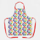 Great color and even though I ordered the kid size, it covers well enough to use during the holidays. I am not a big woman and prefer a shorter apron. I stand 5"6" and the length of the garment goes to mid-thigh. The tie straps fit well at my waist and even though there is no neck strap adjustment, the opening is plenty big enough. I am happy with the size and fit. I am sharing my apron with my 10 year old grandson, too! The color is vibrant and looks good, as shown on the website. The stitching looks strong and reinforced. Photographed is front side and back side of the apron, reinforced straps and coloring. My phone camera may not be the best at showing the details.