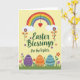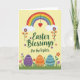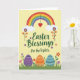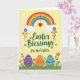 Designed with a soft buttery yellow background, the illustration sets a springtime scene that feels gentle and friendly 🌷. Along the bottom runs a thick band of green grass, dotted with small simple flowers and a tiny butterfly drifting nearby. Rising from the grass are three decorated egg shapes, each with detailed patterns in violet, warm orange, and calm teal, arranged close together like companions leaning in. Centered above them sits a short Easter greeting in emerald green cursive-style lettering, with a few small blossoms tucked around it like a quiet embrace 🐰. Near the top, a wide rainbow arches across the card, outlined with neat white dots that add a sprinkled look. Two pale clouds float under the rainbow, and a bright red heart hangs between them as if gently shared. The rainbow’s bands sweep from one side to the other in layered colors, with the dotted outline tracing the curve above the clouds.