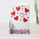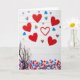 This card shows an overhead scene set on a white wooden plank background, where paper hearts are scattered like little notes passed between close friends and sweethearts 🥰. Several large red hearts sit front and center, their rich color drawing the eye the way a lingering glance does. Around them, smaller hearts in blue, purple, and pink dot the space, giving the layout a light, floating rhythm ❤️. A few rainbow-striped hearts add a modern touch and sit comfortably among the other colors, like everyone belongs in the same celebration. One red heart is only an outline, leaving airy space inside it that feels like an open invitation. In the lower-left area, a bare, knotted branch reaches in, its thin twigs spreading over a dense patch of tiny multicolored hearts like confetti on the floor. There’s no text on the design, just bright, even lighting that makes the reds and pastels pop against the pale wood grain.