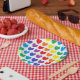 Abstract digital are of rows of rainbow colored hearts against a white background. Colors including red, orange, yellow, green, blues, purple.