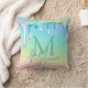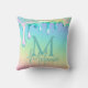 This custom throw pillow features a luxurious iridescent rainbow drip design over a glamorous rainbow gradient background. Holographic liquid is dripping across the top portion. A sample monogram initial and name are printed in the center which you can personalize to include your own name or other custom text.