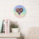 This custom wall clock features a Valentine love theme with a photograph heart frame. The background is a rainbow gradient pattern with holographic rainbow style frame. A sample photo of friends or a couple is placed in the center.