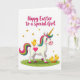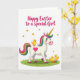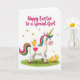 This design shows a white, horse-like fantasy creature standing in spring grass, with a rainbow mane and tail in fuchsia, green, and other bright tones. A spiraled golden horn rises from its forehead, and a fuchsia heart sits on its side like a sweet badge of affection. Its wide eyes, pink cheeks, and gentle posture suggest a friendly, caring presence, like it’s leaning in to greet someone close. Three small yellow chicks add a cozy, companionable touch—one rests on its back while two wander nearby as if following along together. A fresh orange carrot lies in the grass, and a few tiny details make the scene feel like a shared little picnic moment 🐰. Golden heart shapes drift across the white background, echoing the tender bond between the characters without needing anything else. Near the top, a seasonal greeting appears in flowing pink lettering, centered and easy to spot 🌷. The white backdrop stays mostly open, with scattered golden hearts above and the green grass band along the bottom.