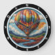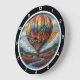 This circular wall clock features a highly dimensional, layered illustration dominated by a large, colorful hot air balloon. The balloon's canopy is patterned with stripes and blocks of every rainbow color, appearing to float directly over the clock face. Below, a winding river flows through a hilly landscape rendered in rich, textured tones of orange, brown, and green, suggesting an autumnal or sunset scene. White, layered clouds frame the scene against a light blue sky, creating a paper-cut or 3D effect. The clock face is surrounded by a white inner ring and a wide, solid black outer frame.