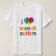 Tshirt with rainbow design on words "I (heart image) someone with autism". The heart image has multi-colored puzzle pieces on the inside.