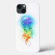 Large, iridescent, artistically drawn, bright jellyfish, with long tentacles on white, painted over with multicolored watercolor background. Rainbow jellyfish.
