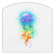 Large, iridescent, artistically drawn, bright jellyfish, with long tentacles on white, painted over with multicolored watercolor background. Rainbow jellyfish.