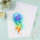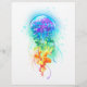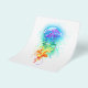 Large, iridescent, artistically drawn, bright jellyfish, with long tentacles on white, painted over with multicolored watercolor background. Rainbow jellyfish.