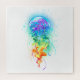 Large, iridescent, artistically drawn, bright jellyfish, with long tentacles on white, painted over with multicolored watercolor background. Rainbow jellyfish.