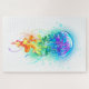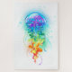 Large, iridescent, artistically drawn, bright jellyfish, with long tentacles on white, painted over with multicolored watercolor background. Rainbow jellyfish.
