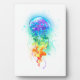 Large, iridescent, artistically drawn, bright jellyfish, with long tentacles on white, painted over with multicolored watercolor background. Rainbow jellyfish.