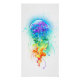 Large, iridescent, artistically drawn, bright jellyfish, with long tentacles on white, painted over with multicolored watercolor background. Rainbow jellyfish.