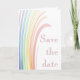 Fully customizable wedding save the date card with modern rainbow wave design.