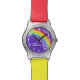 Bright colourful rainbow graphic design watch. Ideal for kids, teens or anyone who like bright colours. Personalise with your own strap colour choice and name, currently reads Olivia. Designed by Sarah Trett. www.sarahtrett.com